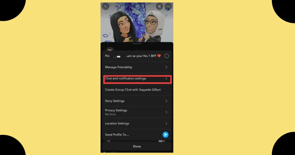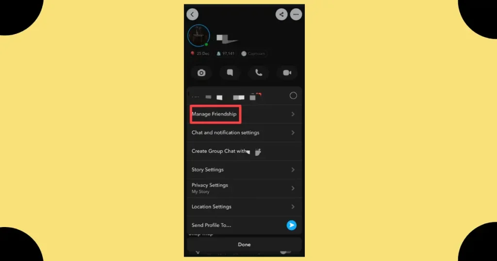 When you open the menu on Snapchat, choose the Manage Friendship option to take action on your interaction or relationship. This selection lets you confirm your choice, verify the contact, and control your communication on the platform through a clear interface.