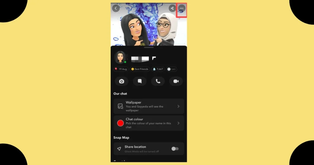 When using Snapchat, go to the user’s profile and tap the three dots at the top right corner to open the menu. This reveals various options in the interface, helping you check visibility, interaction, or access.
