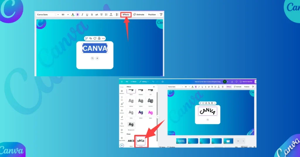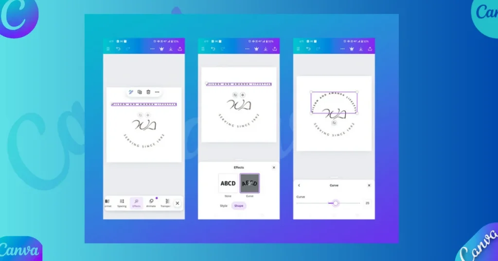Open the Canva app, select your text, tap the purple button to access the menu, hit “Effects,” choose the curve tool from the options, and adjust as you want.