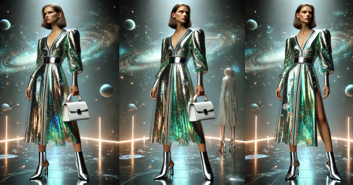 An iridescent dress from this collection isn’t just an outfit—it’s a first-class ticket to the future. Its shimmering sheen reflects the vast darkness of the universe, with hints of green and silver that evoke the lights of spaceships destined for Mars.